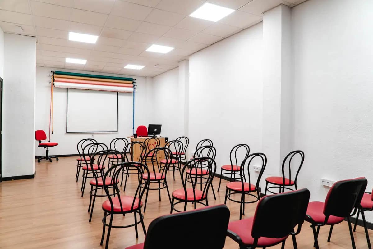 Configura el espacio según tus necesidades, con capacidad para 30 personas en formato charla y 16 puestos en formato aula.